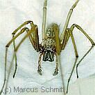 Spinne (bis 2cm), Körper kurz behaart; Beine wirken unbehaart, sind länger als Körper, keine Zeichnung;